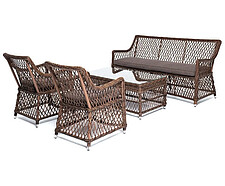 Оплетка выполнена вручную искусственным ротангом бежевого цвета, диван и кресло укомплектованы подушками из 100% полиэстера, которые пропитаны специальным составом, обладающим влагоотталкивающим свойством.