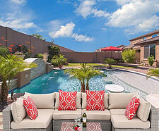 Мебель не выгорает на солнце, устойчива к любым видам осадков и перепадам температуры. Уход за мебелью: протирать влажной тряпкой (допускается использование мыльных моющих средств).
