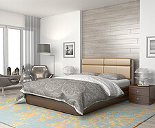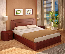 Кровать выполнена из массива дерева, ДСП, шпона бука, обивка - экокожа.
