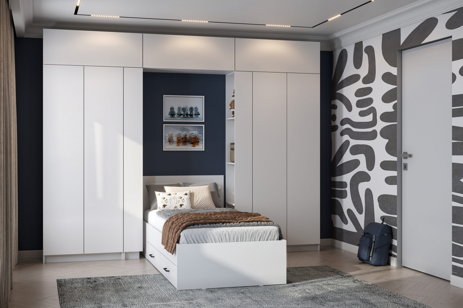 Комплект идеально подходит для детской или подростковой комнаты, где важно организовать порядок и создать уютную атмосферу. Вместительные шкафы и ящики помогают поддерживать чистоту: используйте коробки, корзины и органайзеры для одежды, игрушек и школьных принадлежностей. На открытых полках удобно разместить книги, сувениры, фоторамки или элементы декора, а навесные модули можно дополнить стильными коробками для хранения мелочей.