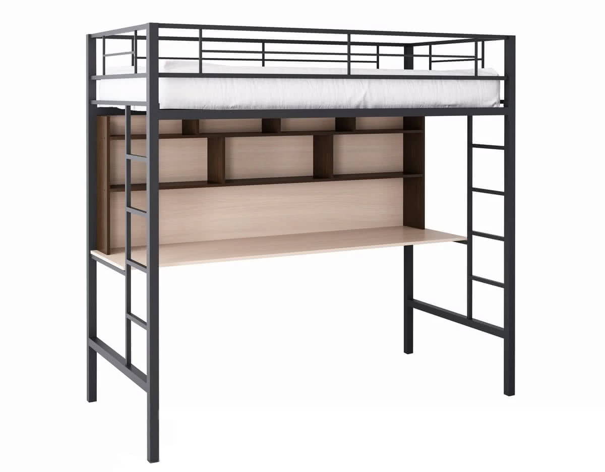 Кровать-чердак Формула мебели Севилья 1.2 — современное решение для организации пространства в детской или подростковой комнате. Верхний ярус предназначен для сна, а под ним размещена удобная рабочая зона с вместительным столом и открытыми полками для книг, учебников и декора. Прямые линии, лаконичный дизайн и металлический каркас делают кровать универсальной для любых интерьеров.
