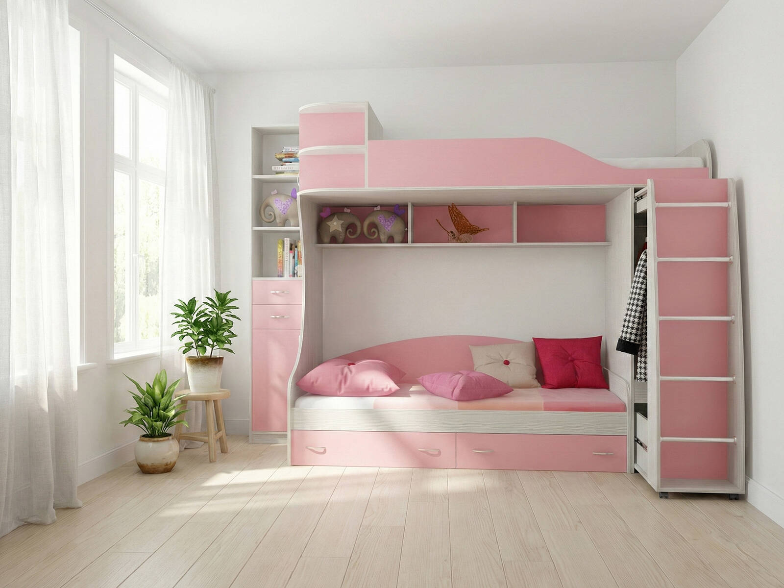 Оригинальная кровать для двоих детей с одинаковым размером спального места на двух ярусах. Для хранения постельного белья и иных принадлежностей внизу кровати предусмотрены выдвижные ящики, а сверху у изголовья - антресоль, которая представляет собой с внутренней стороны изолированный ящик с дверью, с внешней стороны — две открытые полки для разнообразного использования.