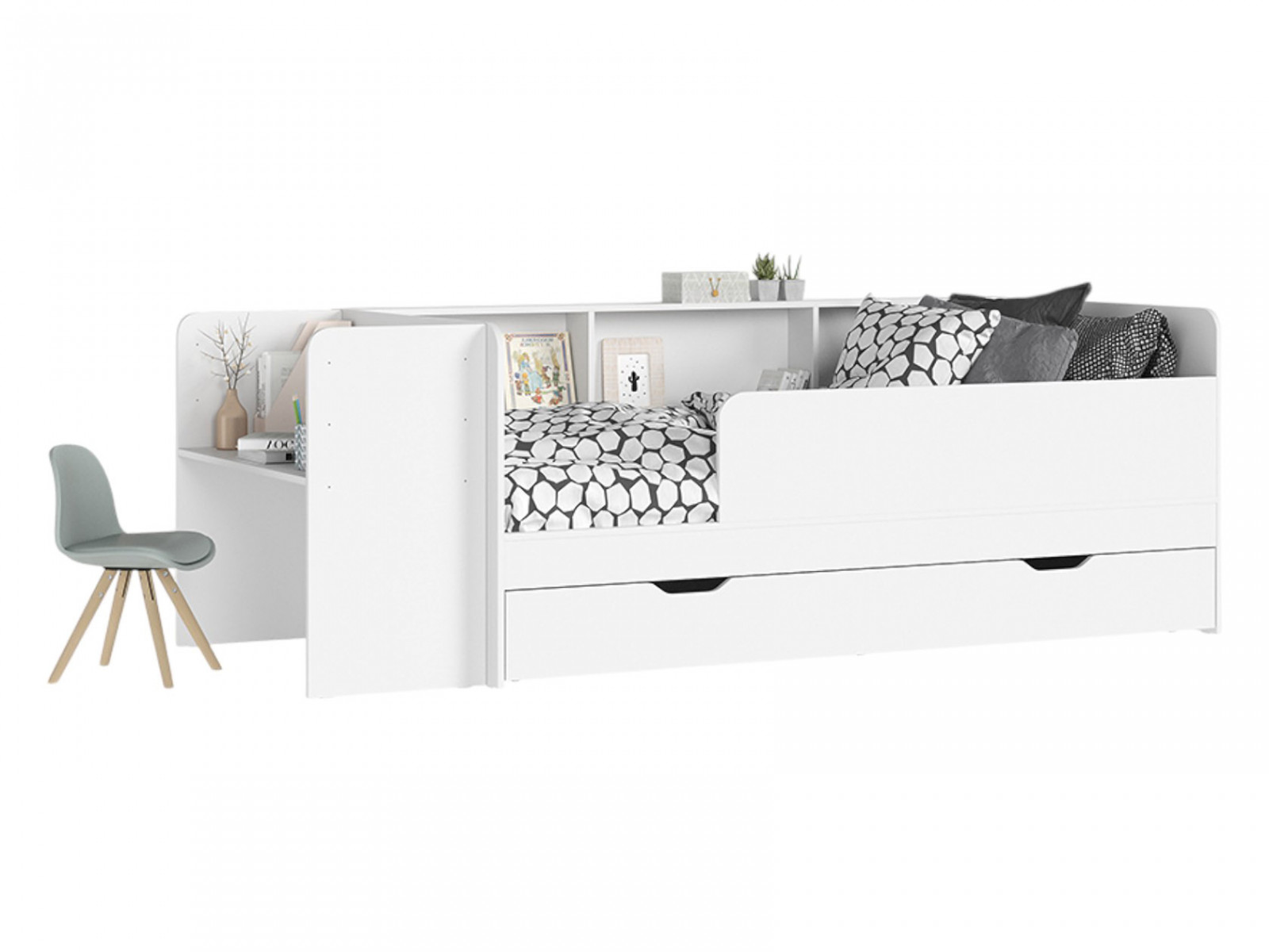 Главная особенность модели — дополнительное выдвижное спальное место, что делает кровать идеальной для семей с двумя детьми или для организации гостевого спального места. Высокие бортики (30 см) обеспечивают безопасность, а универсальная ориентация сборки позволяет адаптировать кровать под любую планировку комнаты. Просторная столешница сбоку отлично подходит для занятий, творчества или чтения, а открытые полки вдоль изголовья позволят держать книги, игрушки и декор всегда под рукой.