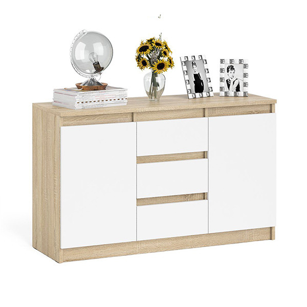 Комод–тумба оборудована по центру тремя выдвижными ящиками и двумя закрытыми отделениями с полками по бокам.