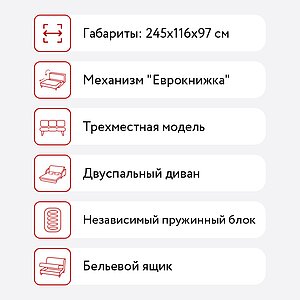 Диван Куба имеет удобный механизм складывания "Еврокнижка". Сиденье дивана выдвигается, а спинка опускается вперед, образуя ровное место для сна. Такой диван не составит труда сложить и разложить каждый вечер и утро.