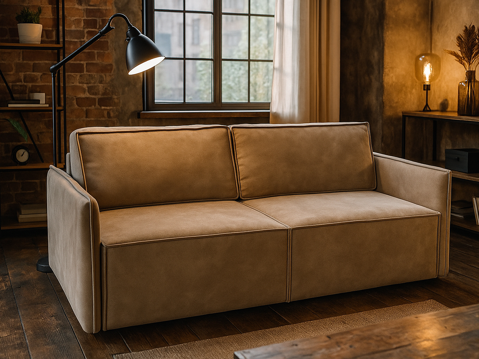 - Сочетайте диван с журнальным столиком в стиле минимализм или сканди, напольными торшерами и лаконичными стеллажами.