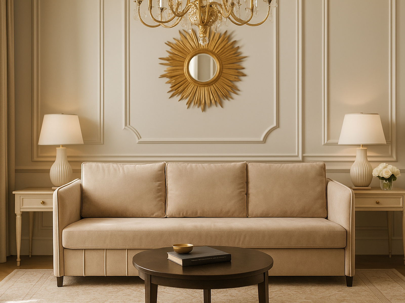 - Диван отлично сочетается с журнальным столиком в светлых или темных тонах, ковром с геометрическим рисунком, настенными бра и лаконичными полками.