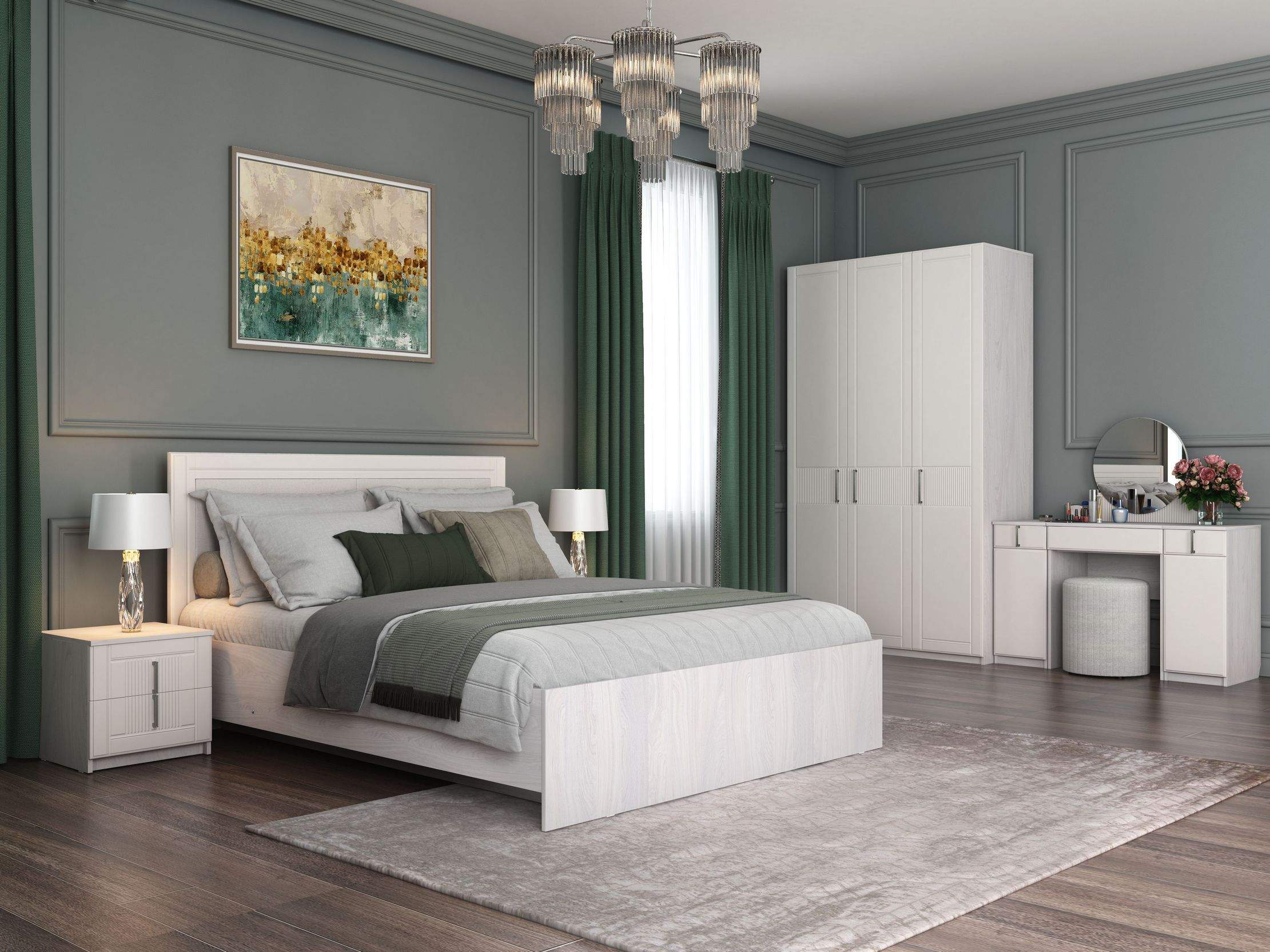 Состав комплекта (Ш?В?Г, мм): Кровать 160?200 с щитовым основанием (2110?970?1705), Тумба прикроватная — 2 шт. (440?440?350), Комод 3 ящика (1005?885?480), Стол туалетный (985?780?475), Зеркало (800?850?20), Шкаф 4-х дверный (1745?2355?600).
