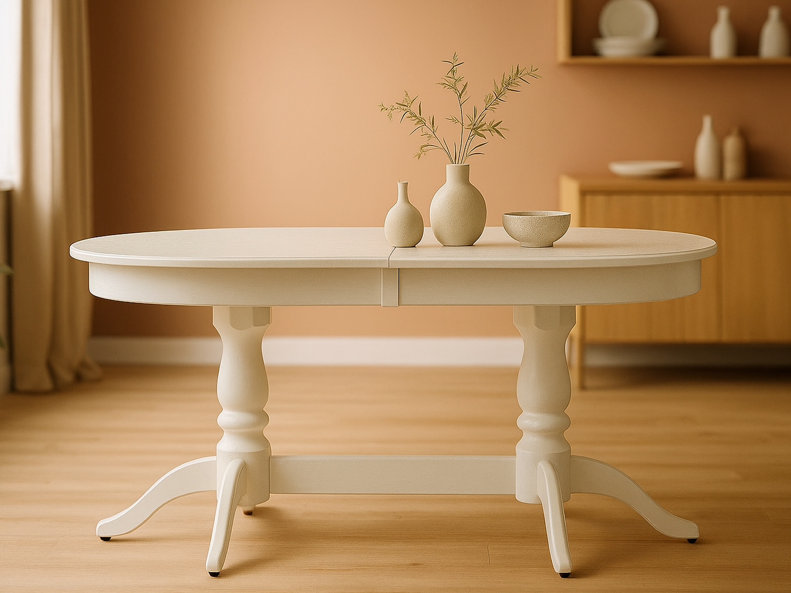 Для декорирования используйте скатерти пастельных оттенков, вазы с цветами, минималистичные подсвечники. Разместите стол в центре столовой или кухни — он станет уютным местом для общения и совместных трапез.