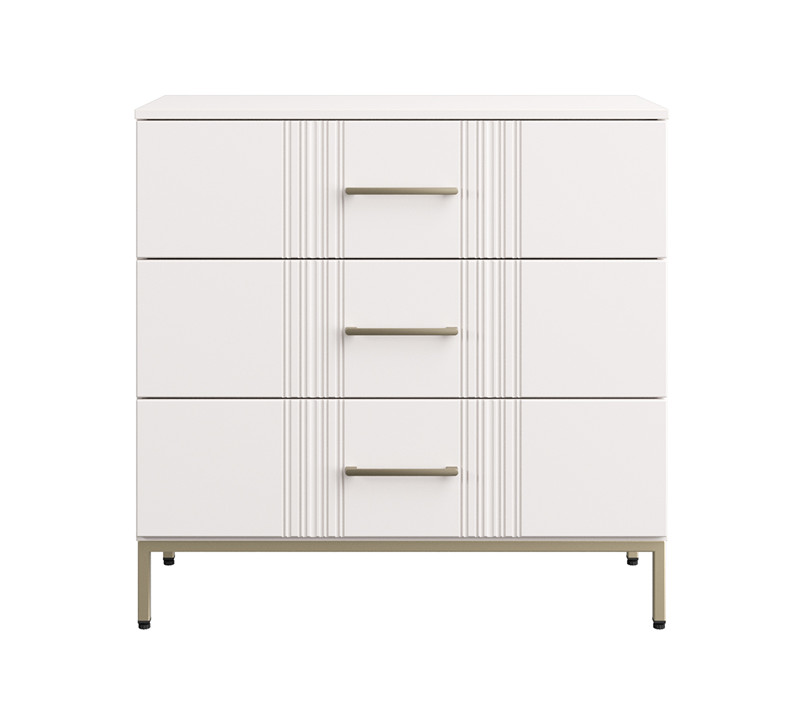 Особое внимание привлекают изысканные детали комода. Металлические ручки и ножки в оттенке «шампань» гармонично сочетаются со светлым цветом «кашемир» и рифлёными вставками. Такое оформление придаёт комоду утончённый и современный характер.