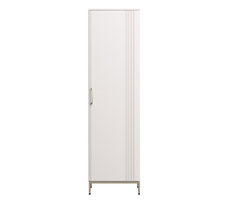 Компактный, но вместительный шкаф-пенал. За распашной дверцей с рифлёной вставкой и металлической ручкой скрываются просторные полки, на которых удобно разместить вещи, текстиль или аксессуары.