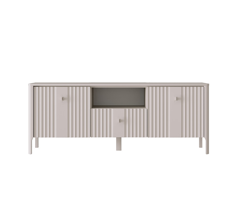 Материал: корпус - ЛДСП, фасад - МДФ с фрезеровкой, задняя стенка - ХДФ, ручки - металл, опоры - МДФ с фетровым подпятником.
