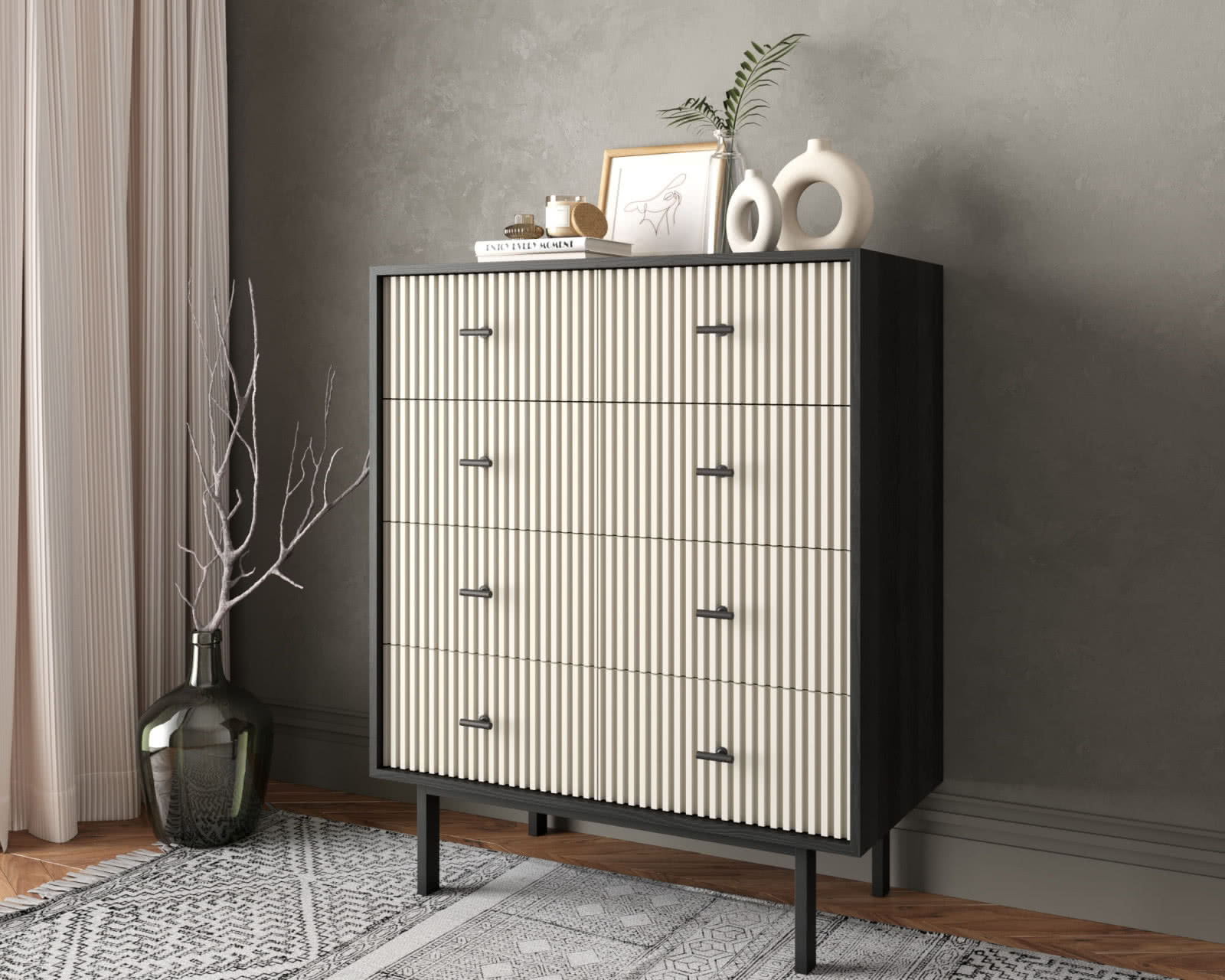 Модель оснащена восемью вместительными ящиками на шариковых направляющих, что обеспечивает плавное и лёгкое открывание. Петли с доводчиками делают использование комода максимально комфортным и тихим. Высокая форма и компактная ширина комода позволяют разместить его даже в небольших пространствах, не перегружая комнату.