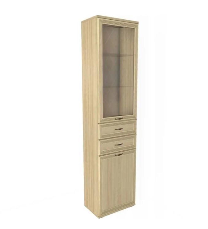 - Верхняя часть шкафа дополнена витриной: за стеклянной дверцей удобно разместить любимую посуду, книги, коллекции или элементы декора.