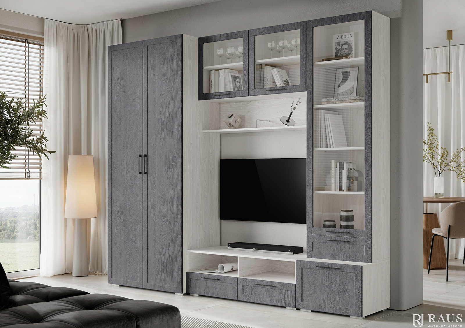Гостиная Raus Студия Квадро — это современное решение для оформления функционального и стильного пространства в вашей квартире или доме. Комплект выполнен в спокойных тонах с гармоничным сочетанием текстуры корпуса и фасадов, что отлично вписывается в светлые и минималистичные интерьеры. Композиция включает вместительный шкаф для одежды, секции с застекленными дверцами для хранения и демонстрации книг или декора, а также удобную нишу для телевизора с полками для техники и аксессуаров.