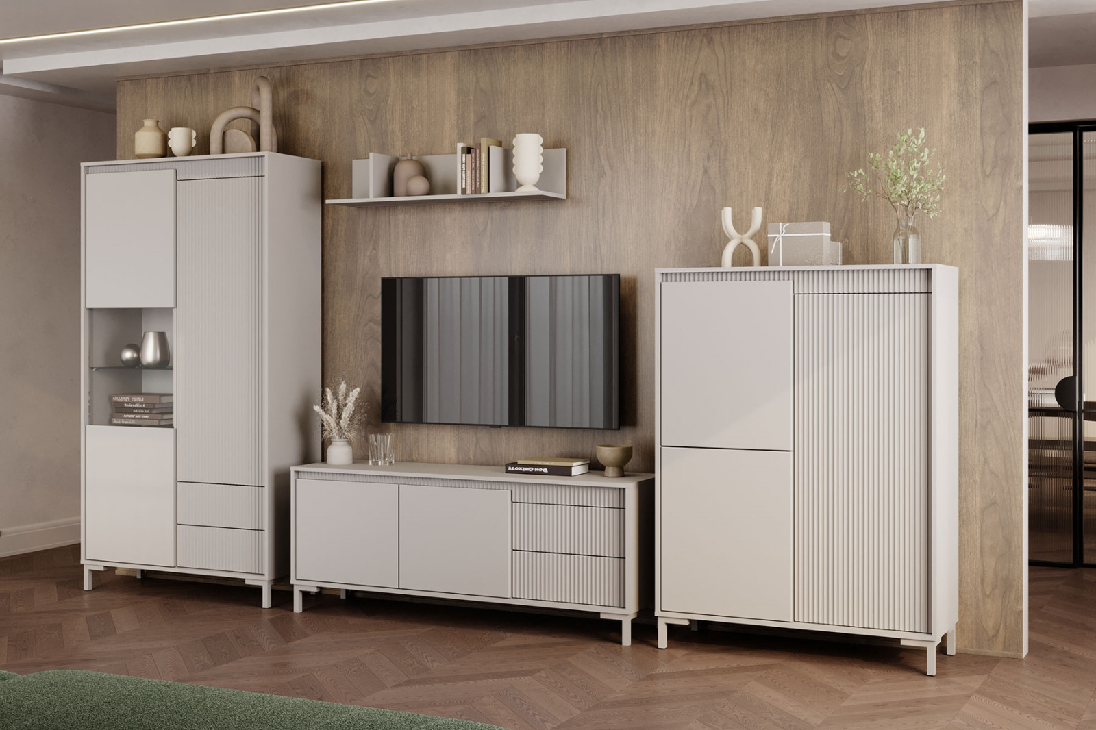 Гостиная СтолЛайн Свейн, Комплектация 2 — это современное решение для стильного и функционального оформления гостиной. Комплект выполнен в светлых тонах с лаконичными фасадами, вертикальным рифлением и строгими линиями, которые придают интерьеру свежесть и легкость. Модули на высоких ножках визуально делают композицию более воздушной и современной, а продуманная система хранения помогает поддерживать порядок.