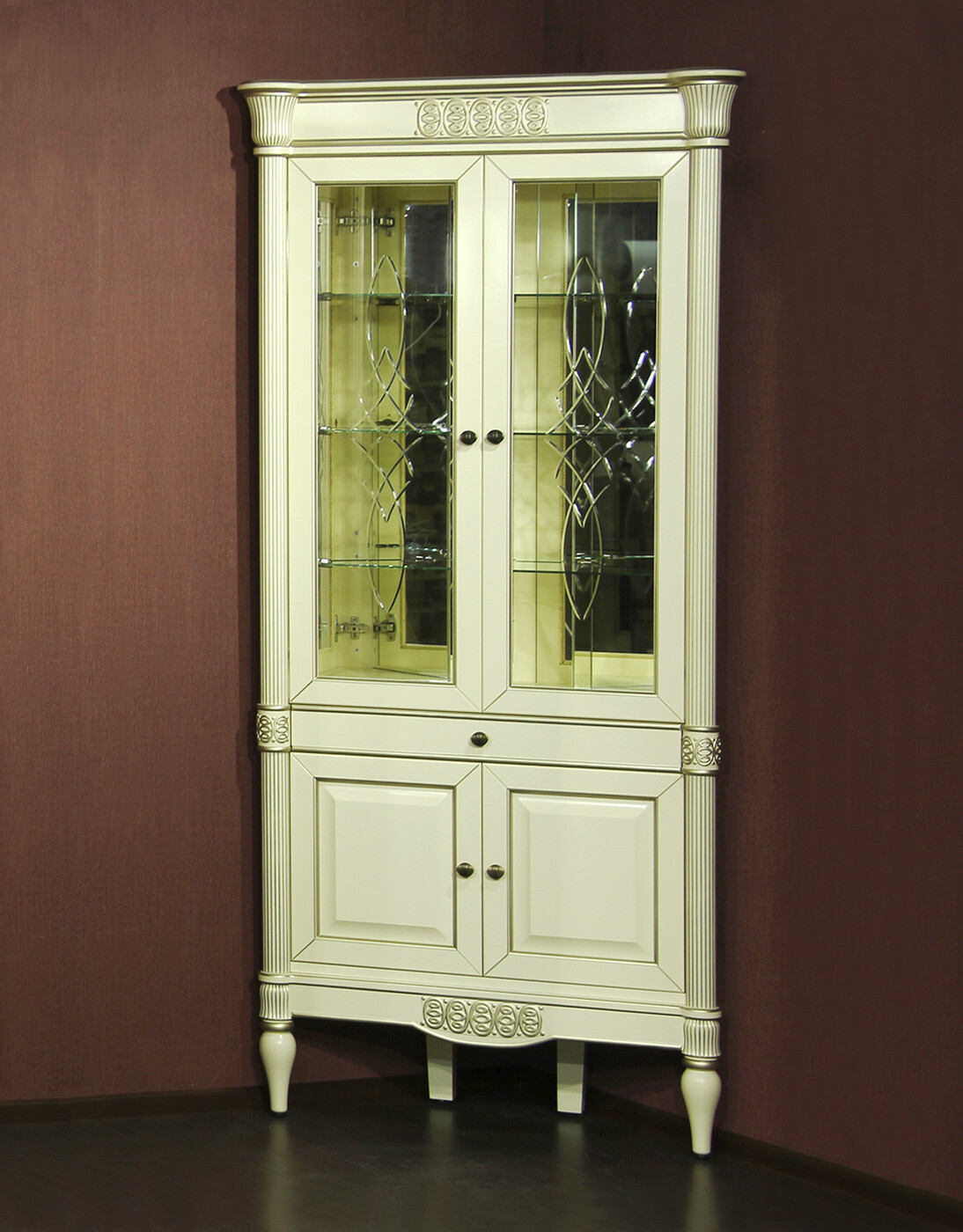Эта модель гармонично впишется в классический, неоклассический или прованский интерьер. Базовый светлый тон шкафа легко сочетается с пастельными стенами, контрастным текстилем и деревянными аксессуарами. Используйте декоративные элементы — фарфор, подсвечники, вазы — чтобы подчеркнуть индивидуальность вашего пространства. Угловой шкаф поможет оптимизировать хранение и украсить любую комнату, сохранив ощущение простора и уюта.