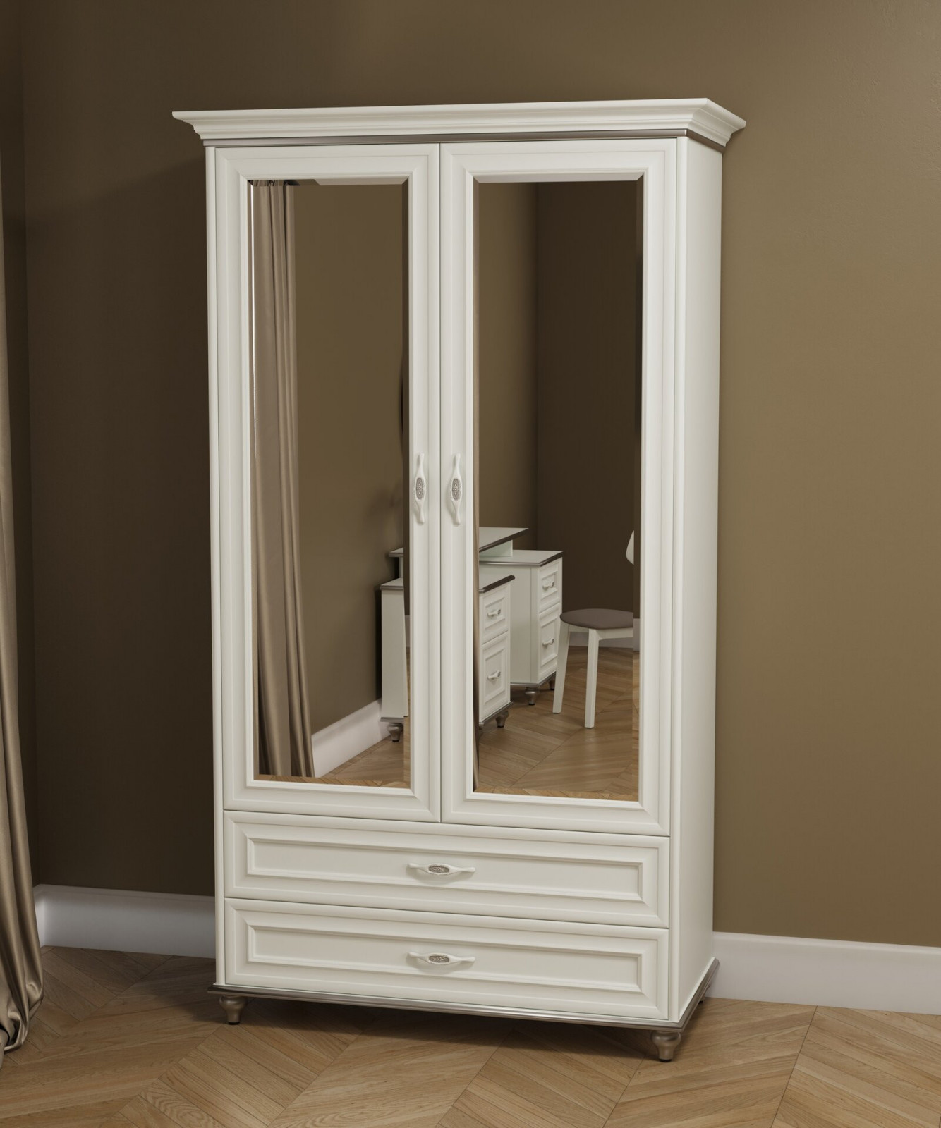 Внутри шкаф оборудован штангой для одежды на плечиках, а также двумя выдвижными ящиками в нижней части для хранения белья, аксессуаров и сезонных вещей. Зеркальные дверцы не только добавляют света и визуального простора, но и делают ежедневные сборы более удобными. Гармоничное сочетание массивной древесины и утончённой фурнитуры подчёркивает статус и долговечность изделия.