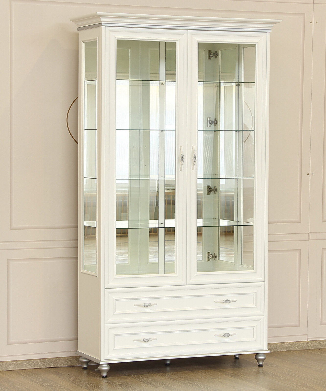 Витрина оснащена двумя стеклянными дверцами и вместительными ящиками в нижней части, что делает её многофункциональной: вы сможете эффектно разместить посуду, книги, коллекционные предметы или элементы декора, а также организовать скрытое хранение мелочей. Прозрачные стеклянные полки и боковые вставки визуально увеличивают пространство и позволяют создать красивую композицию из любимых вещей.