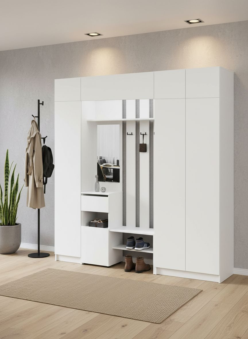 - Идеальна для светлых и просторных интерьеров, а также небольших прихожих, где важна организация хранения.