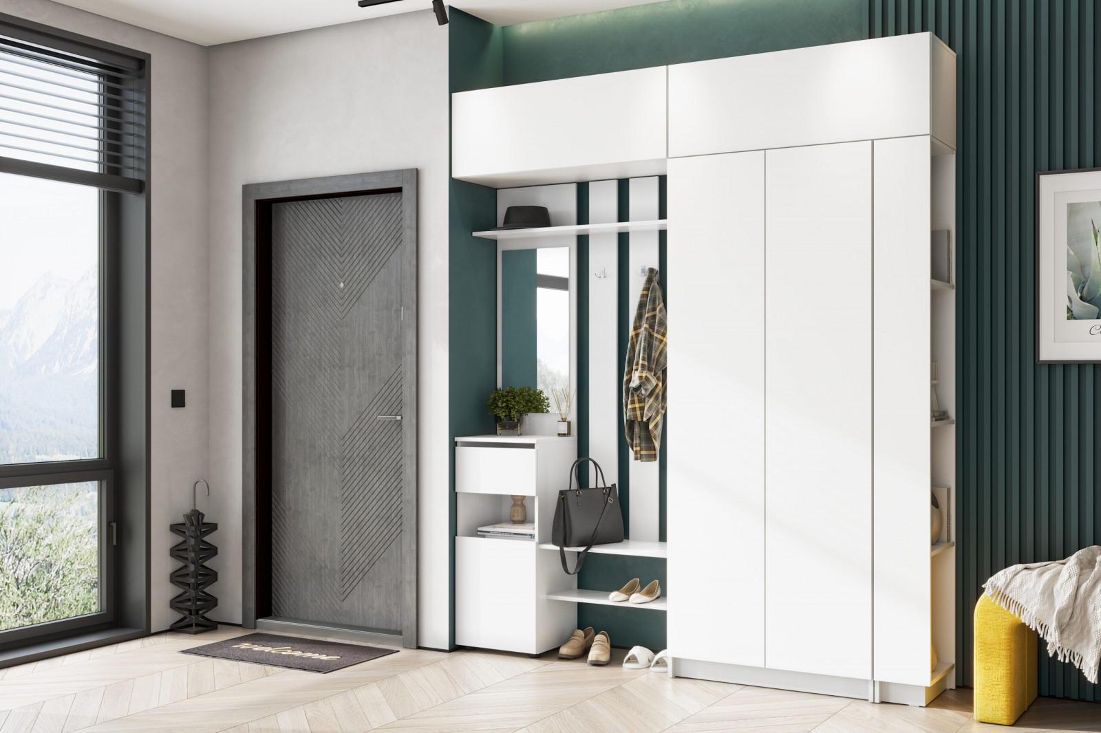 Сочетайте прихожую с мягкими ковриками, стильными пуфами или компактными обувницами. Белый цвет универсален: добавьте яркие акценты — вешалки, корзины или растения, чтобы создать уютную атмосферу. Благодаря зеркалу прихожая наполняет пространство светом и добавляет объема.