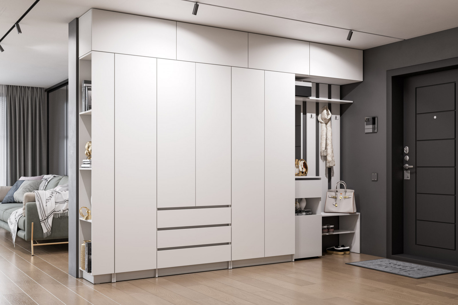 Комплект сочетает в себе вместительные шкафы для одежды, выдвижные ящики на надежных роликовых направляющих и удобные открытые секции для хранения аксессуаров или обуви. ЛДСП корпуса обеспечивает прочность и долговечность всей конструкции. Благодаря продуманной системе хранения вы с легкостью разместите верхнюю одежду, головные уборы, сумки и мелкие предметы, а открытые полки по бокам подойдут для декора или хранения сумок и аксессуаров.