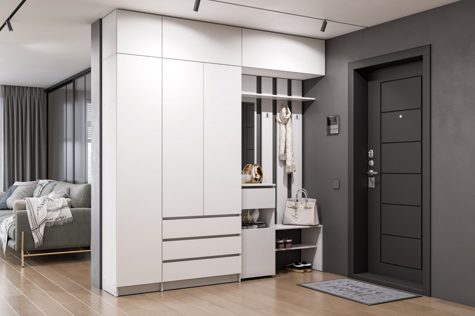 - Легко дополнить декоративными корзинами, органайзерами и стильными ковриками для обуви.