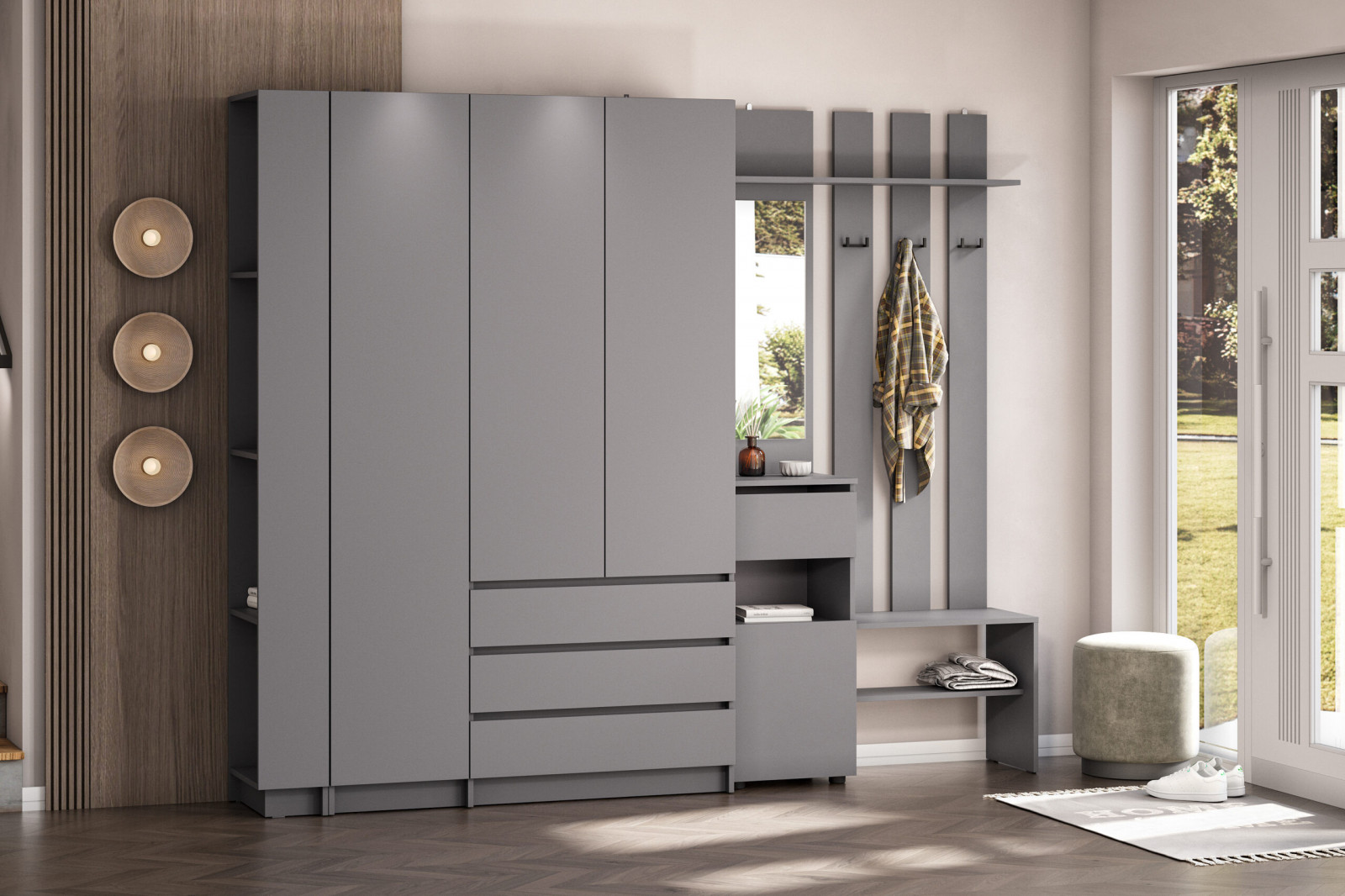 Комплект включает вместительные шкафы для верхней одежды, выдвижные ящики на роликовых направляющих для мелочей, открытую секцию с крючками и полкой для удобного размещения аксессуаров, а также зеркало, которое визуально расширяет пространство прихожей. Благодаря продуманной системе хранения вы легко организуете порядок: обувь, зонты, сумки и шапки всегда будут на своих местах.