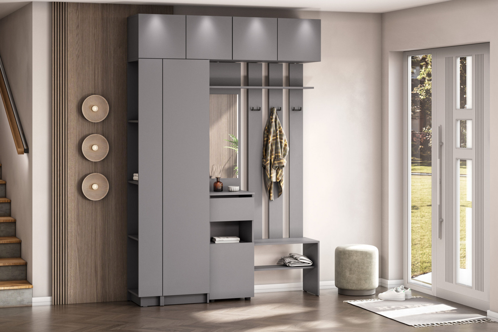 Современная прихожая Арника Бали, Графит. Комплект 16 — это стильное и функциональное решение для вашего дома. Лаконичный дизайн в насыщенном графитовом цвете отлично впишется в интерьер прихожей, коридора или студии. Комплект объединяет вместительный шкаф, открытые полки для аксессуаров и обуви, зеркало и тумбу с выдвижными ящиками — всё необходимое для организации порядка с первого взгляда.