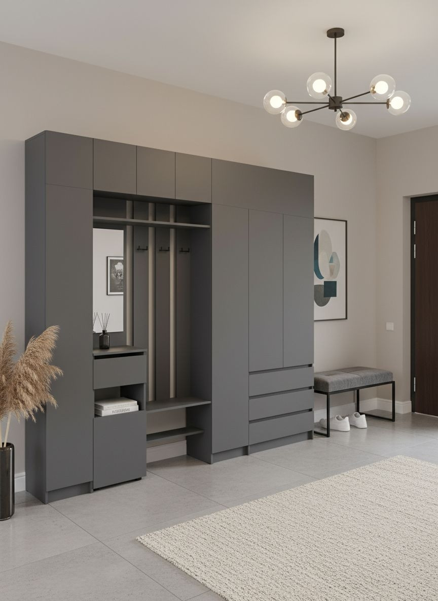 - Включает шкафы для верхней одежды, секции с крючками для сумок и аксессуаров, вместительные ящики и полки.