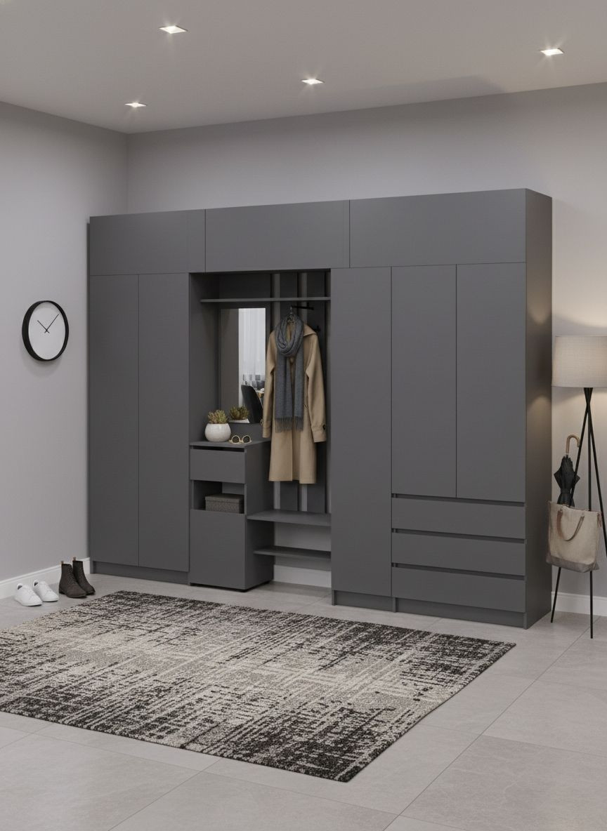- Комплект идеально подходит для просторных прихожих и современных интерьеров в стиле минимализм или лофт.