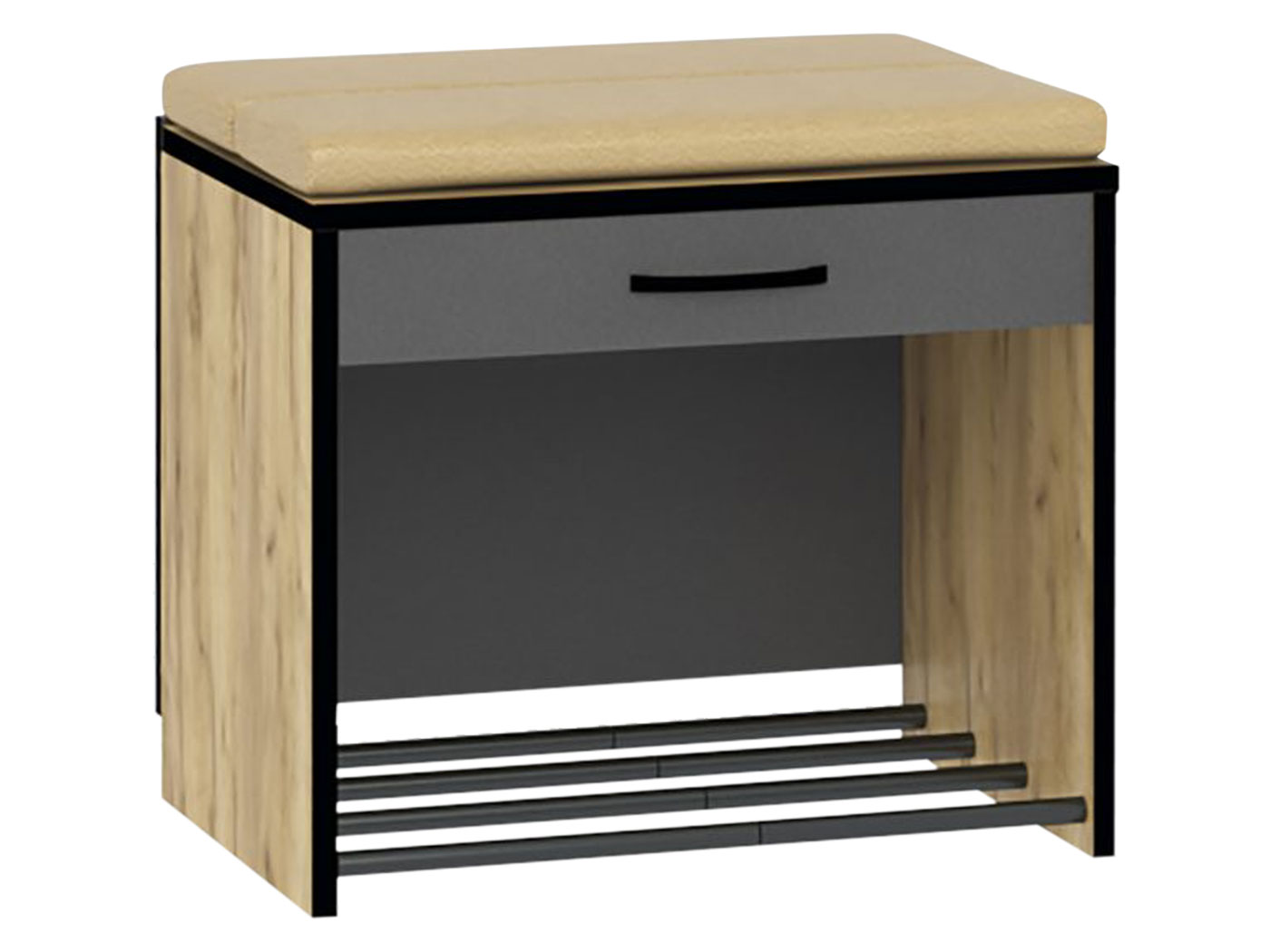 Обувница Ольга в лаконичном исполнении удачно дополнит интерьер прихожей. Сиденье с мягкой обивкой обеспечит особое удобство. Для обуви предусмотрена полочка в виде металлических перекладин, а выдвижной ящик подойдет для хранения различных мелочей.