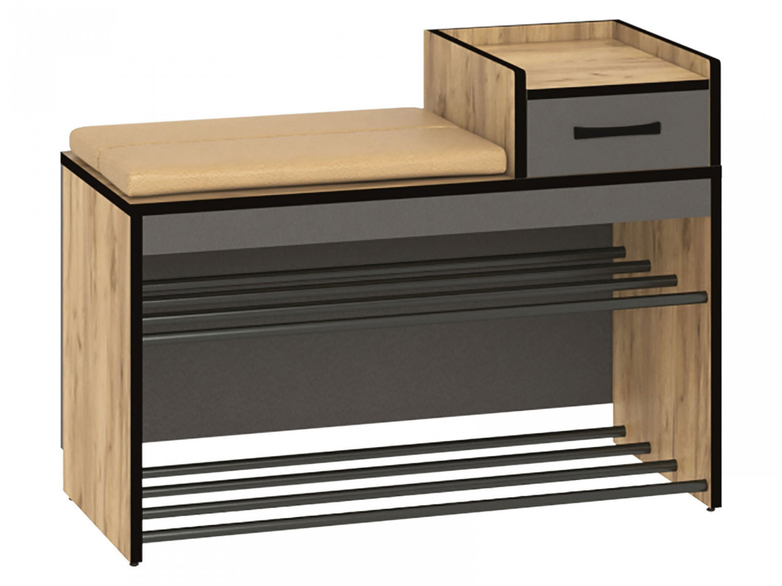 Обувница Ольга в минималистичном исполнении отлично дополнит интерьер современной прихожей. Сиденье с мягкой обивкой обеспечит удобство при обувании. Внизу находятся две полки в виде металлических перекладин, а выдвижной ящик подойдет для хранения полезных мелочей.