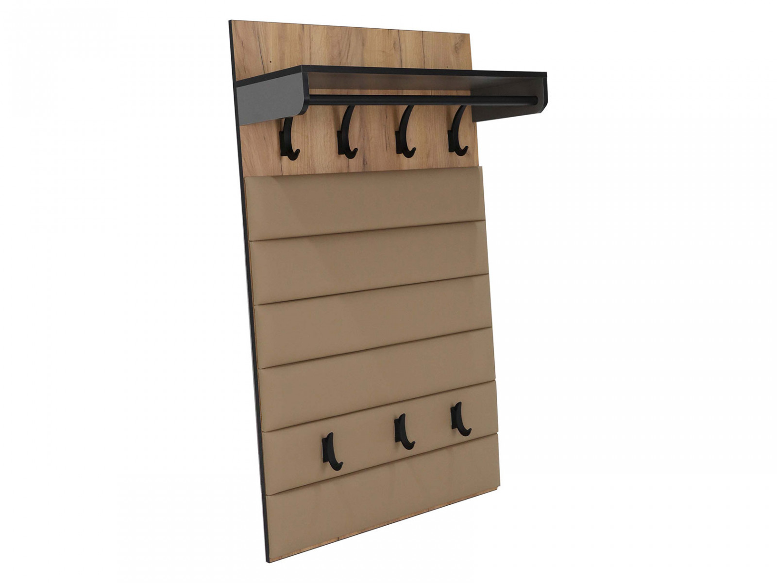 Настенная вешалка Ольга Стандарт в древесном декоре дополнена мягкими накладками, которые смотрятся очень уютно. Крючки на панели расположены на разных уровнях, что позволяет компактно разместить верхнюю одежду и сумки. Верхняя полка идеально подойдет для хранения головных уборов.