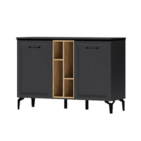 Вместительные отделения за распашными дверцами позволяют удобно разместить одежду, бельё, посуду или бытовые мелочи. Центральная секция с открытыми вертикальными и горизонтальными нишами подойдет для хранения книг, аксессуаров, декоративных корзин или коробок. Используйте корзины или текстильные боксы, чтобы организовать пространство максимально рационально и поддерживать порядок.