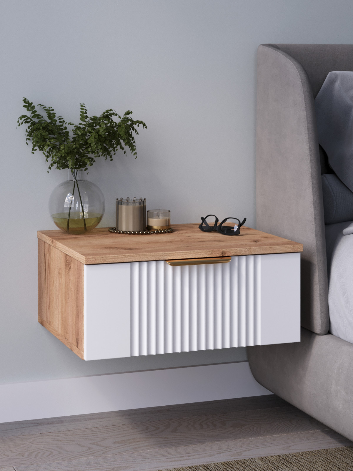 Тумба прикроватная Ингрия Luxe 1 подвесная от бренда «Диван не мебель» — современное и стильное решение для спальни, гостевой или даже компактной студии. Благодаря подвесной конструкции тумба зрительно облегчает пространство и облегчает уборку, а лаконичный дизайн с акцентной фрезерованной фасадной панелью прекрасно сочетается с разными стилями интерьера: от скандинавского до минимализма и современного лофта.