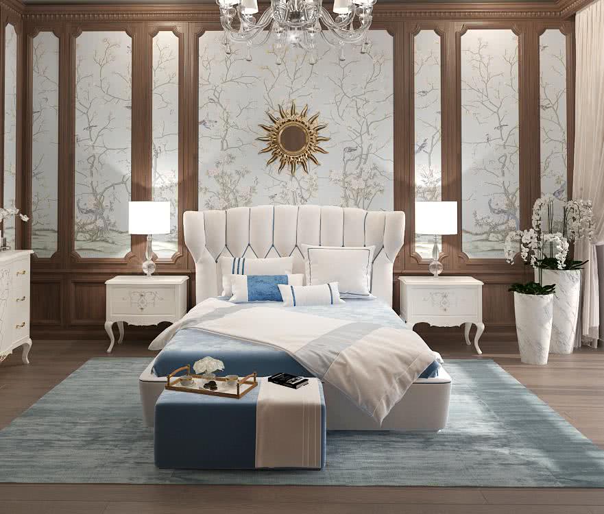 - Кровать прекрасно сочетается с белыми или пастельными оттенками стен, деревянными панелями, зеркалами и картинами в золотых или серебряных рамах.