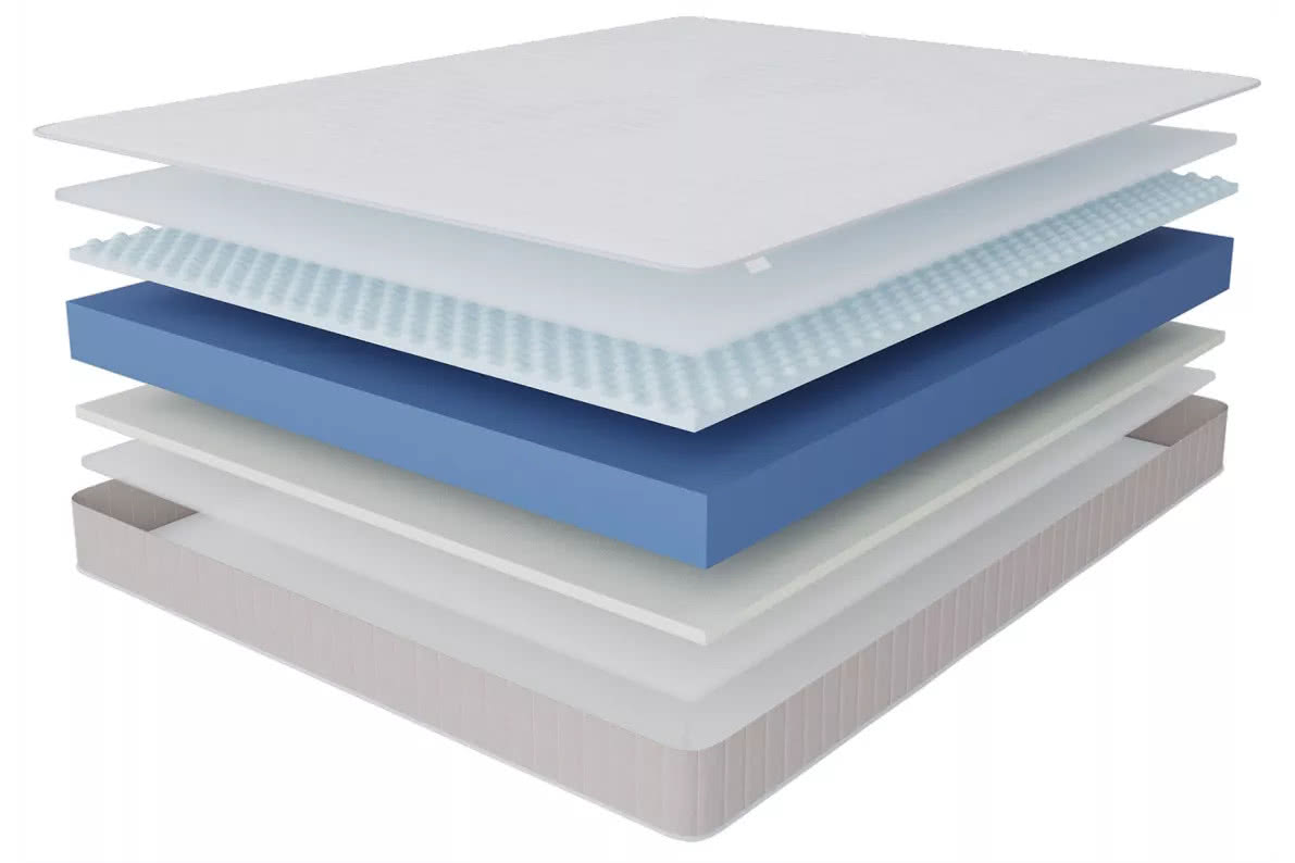 Матрас сделан с применением двух разных по своей структуре пен.Первый слой пены обладает эффектом памяти. За счет пористой структуры и уникальных свойств данный материал приспосабливается к форме тела, температуре и весу человека, снижается риск пережатия сосудов. Так же пена имеет фигурную резку, которая позволяет создавать эффект микромассажа во время сна.