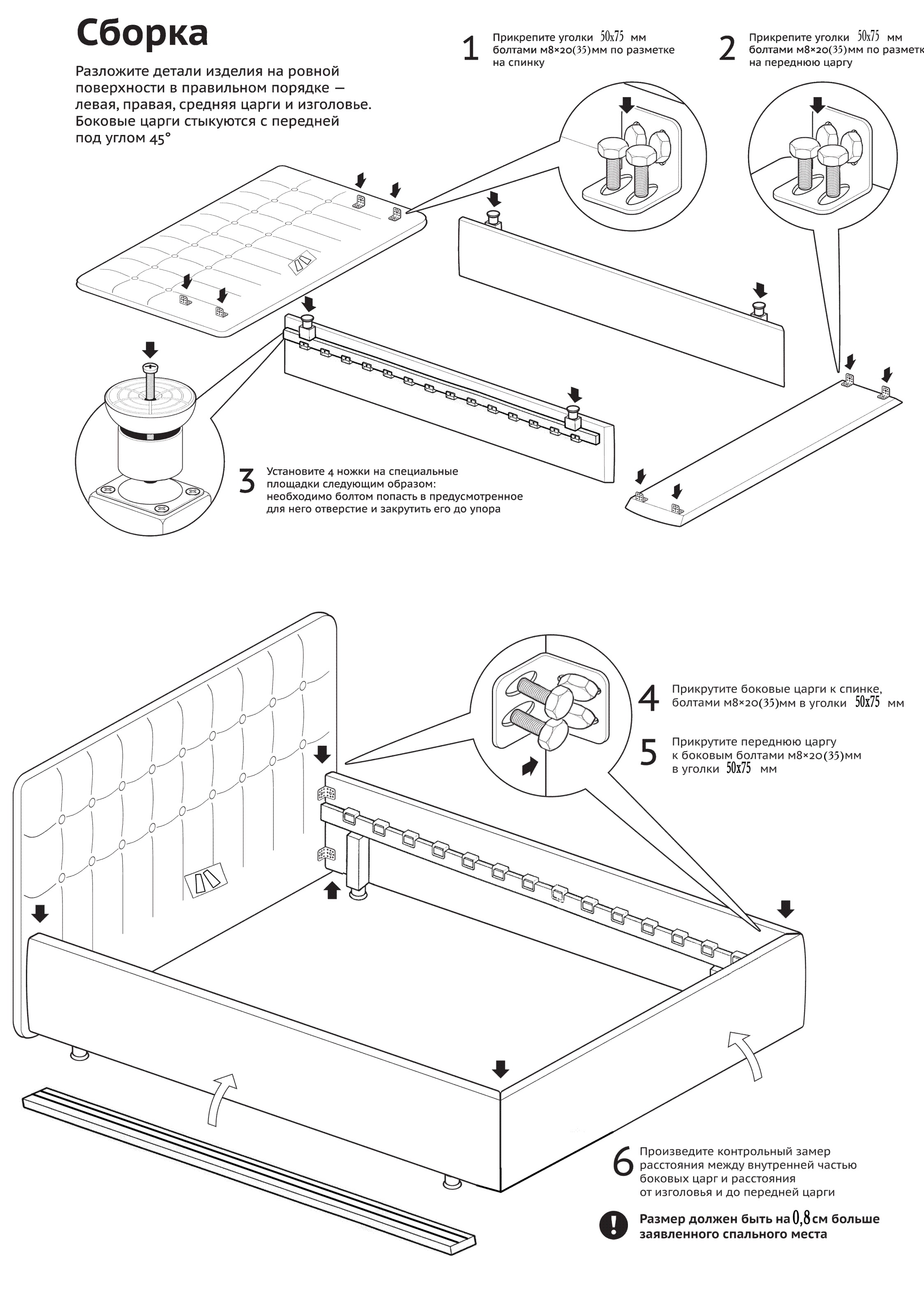 Внешние габариты кровати: + 9 см к ширине, +48 см к длине спального места.