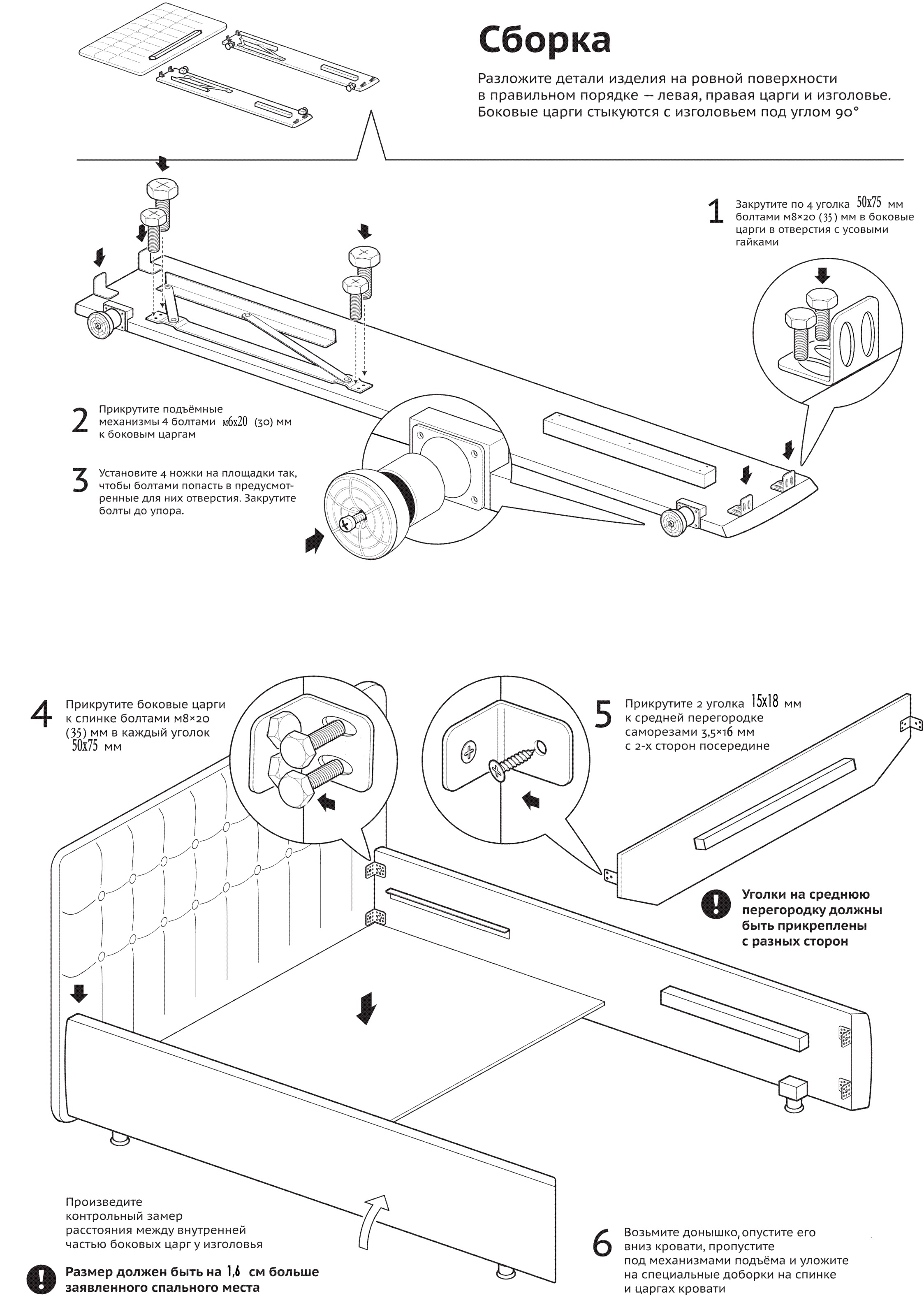 Внешние габариты кровати, см (ДхШ): 214х105/135/155/175/195/215.