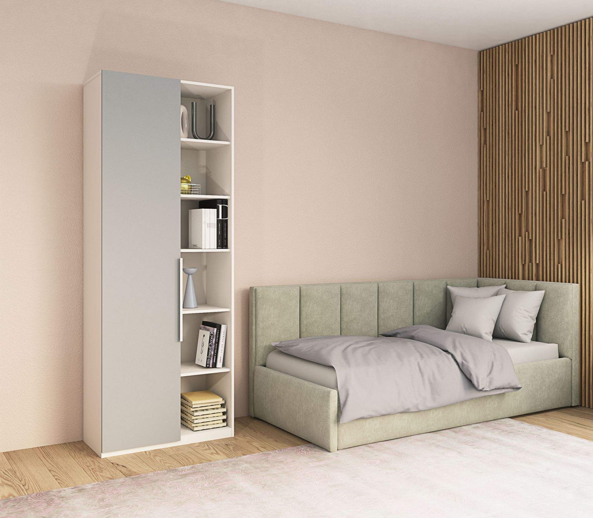 Материал: корпус и фасады - ЛДСП (16 мм), вставки - МДФ, изголовье - ткань (Пегас грей).